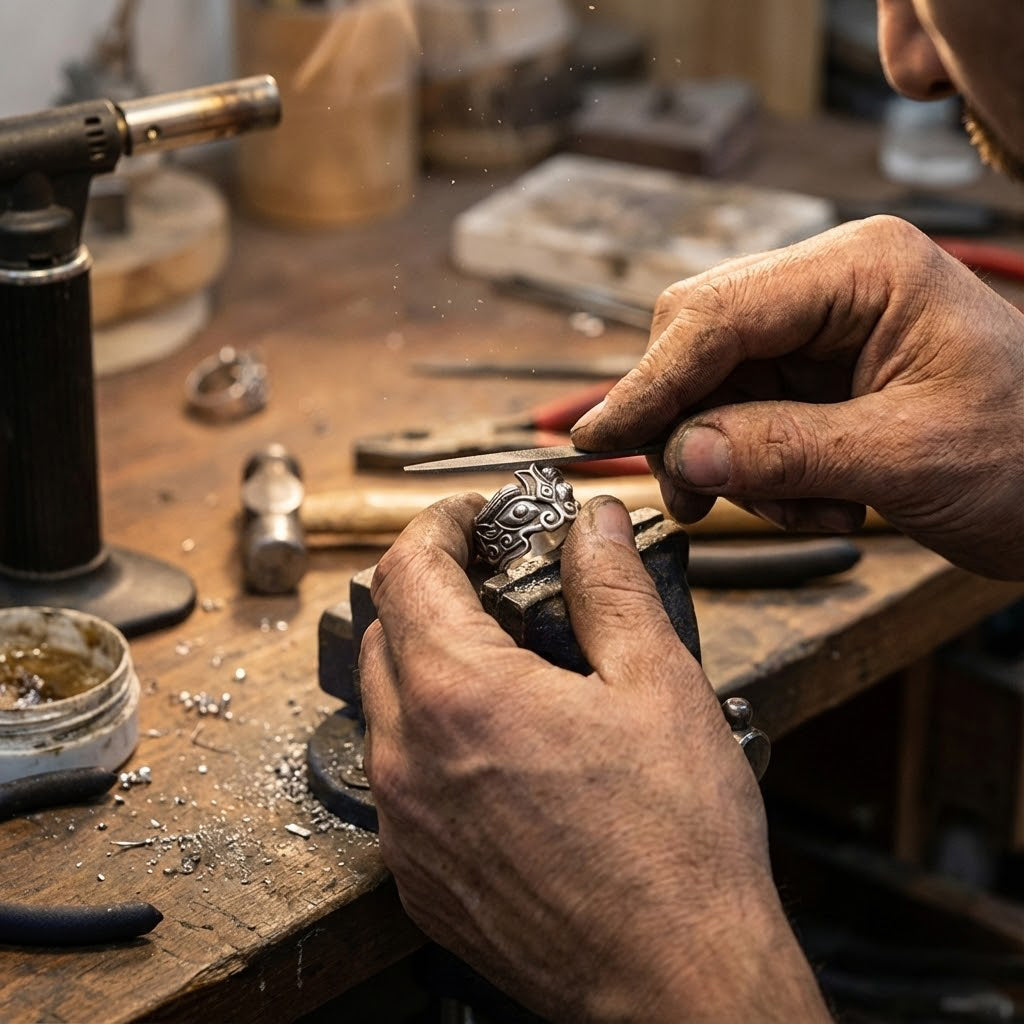ring is a labor of fire and soul. We reject machines in favor of the artisan’s touch, using traditional hammers and flames to breathe life into solid silver. Each piece is hand-carved and meticulously oxidized - craftsmanship you can feel, refined to perfection.